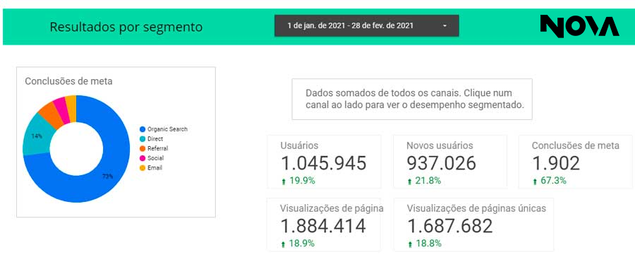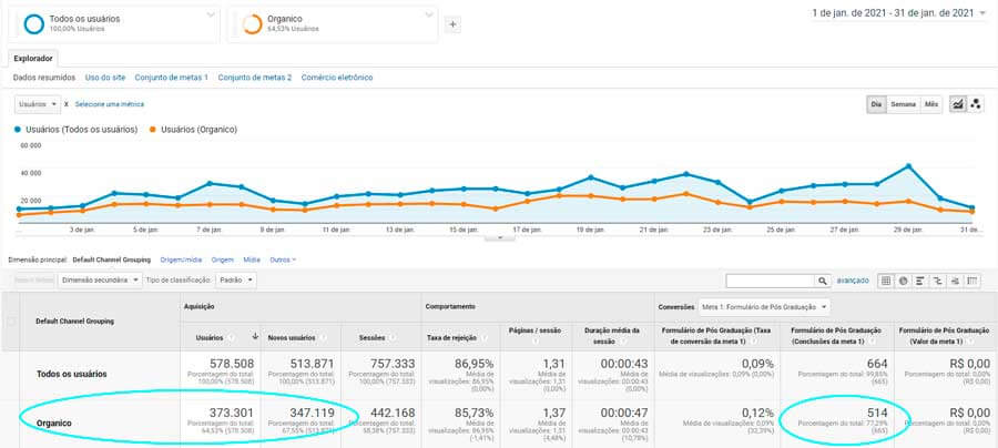 Análise de Canais: a busca orgânica é responsável por 77,29% das conversões de Meta e corresponde a 64,52% do tráfego mensal (mês referência janeiro 2021)