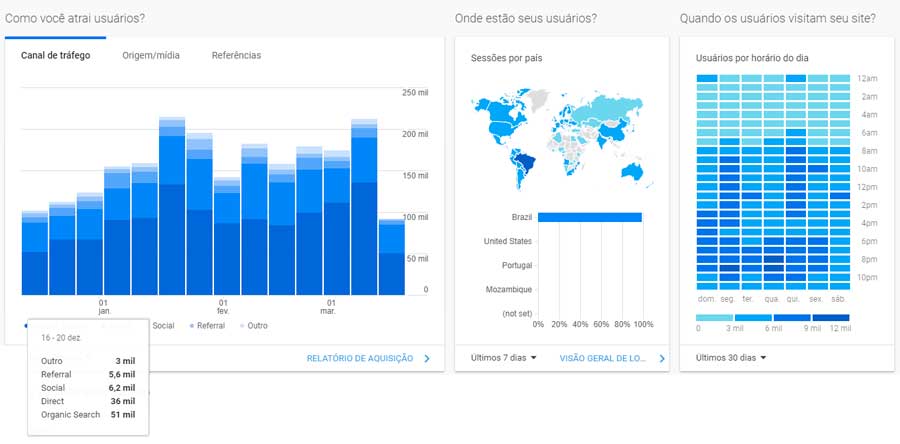 Canais de atração de usuários: Majoritariamente o SEO é o canal que mais leva usuário para o site do ICTQ (referência 16 a 20 de dezembro 2020 no quadro)