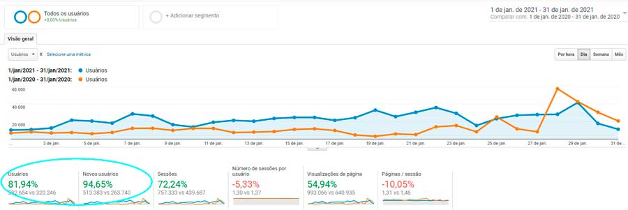 Comparação entre os meses de janeiro de 2020 e janeiro de 2021 – Crescimento de 81,94% de aquisição de usuários.